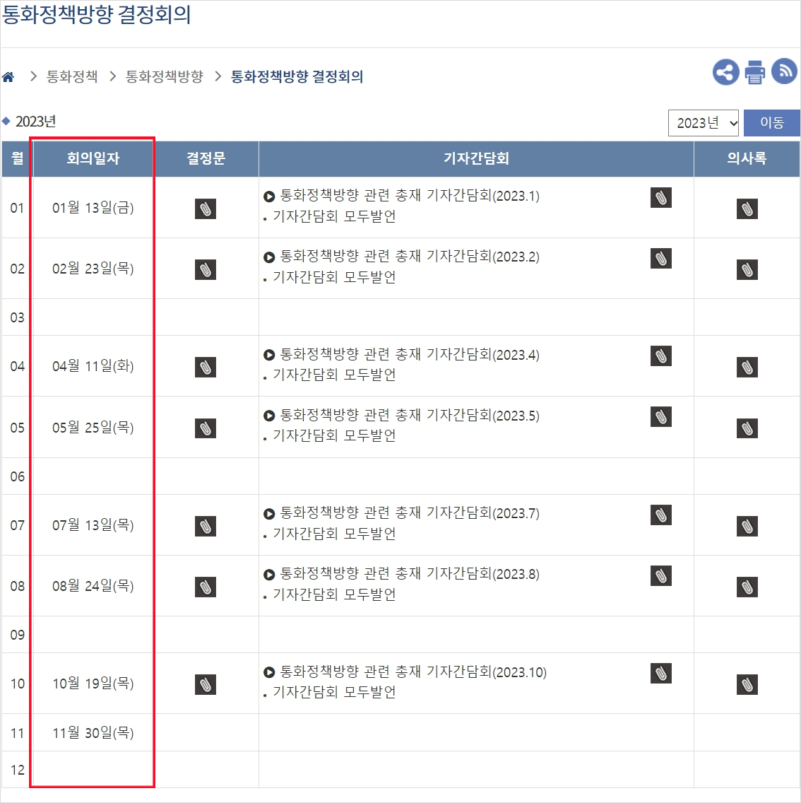 아래 사진을 참고하면 한국은행 홈페이지 - 통화정책 - 통화정책 방향 - 통화정책방향 결정회의 에서 회의 일자 확인이 가능하다. 결정문, 기자간담회 영상 등 파일 첨부가 되어있어 자료확인도 가능하다.