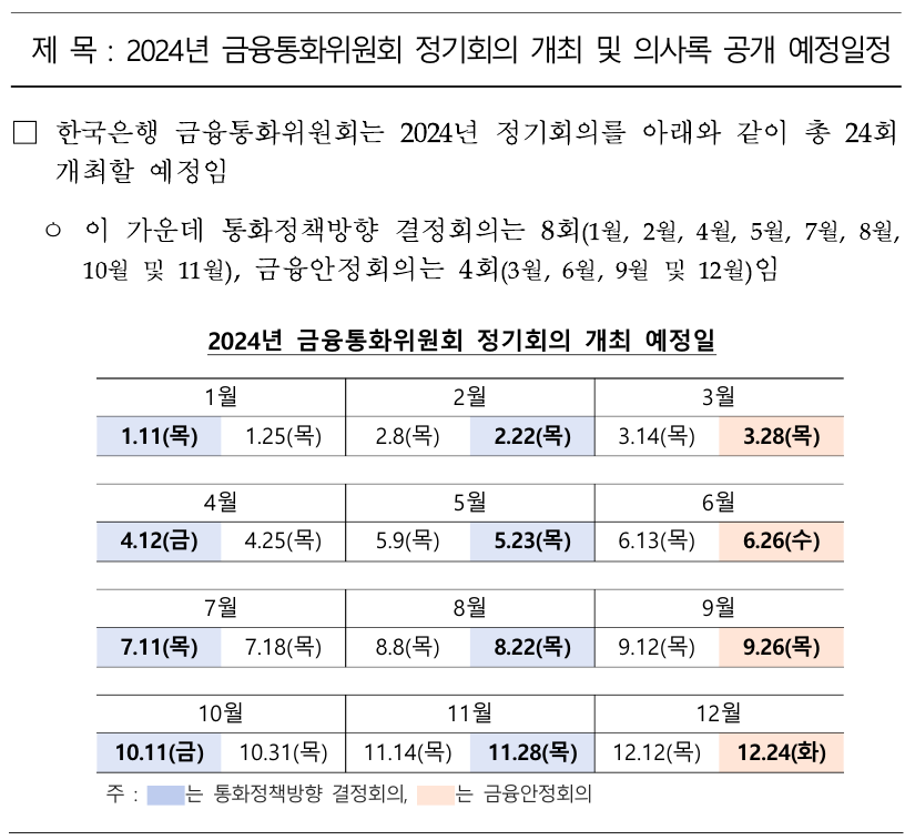 한국은행 보도자료 2024년 금융통화위원회 정기회의 개최 및 의사록 공개 예정일정