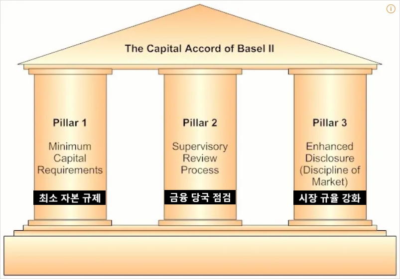 - 바젤 II : 바젤 I은 차주의 신용도에 따라 위험가중치를 설정하지 않고 신용 자산에 대해서 일률적으로 100%의 위험가중치를 적용하는 문제점을 노출했다. 이에 2004년 바젤위원회는 차주의 신용등급에 따라 위험가중치를 다르게 적용하는 논리로 설계된 바젤 II를 발표하였다.