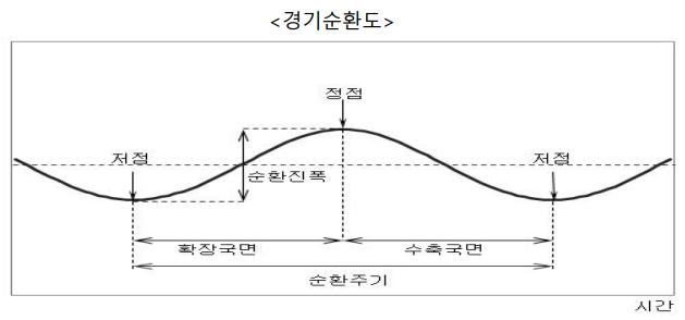 경기는 호황기→후퇴기→불황기→회복기→호황기가 반복되면서 끊임없이 변동하며, 이렇게 경기의 일정한 움직임이 되풀이 되는 것을 경기의 순환(business cycle)이라고 한다.