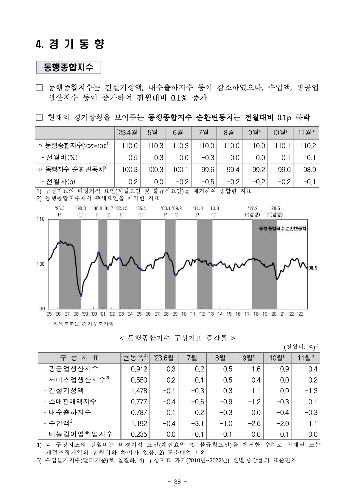 - 동행종합지수는 실제 경기순환과 함께 변동하는 개별지표를 가공·종합하여 만든 지수로 현재 경기상황의 판단에 활용된다.