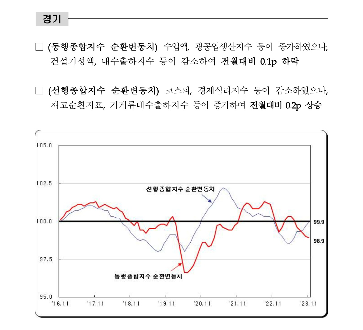한편, 경기종합지수는 경기에 대한 선·후행 관계에 따라 선행종합지수, 동행종합지수, 후행종합지수로 구분한다.