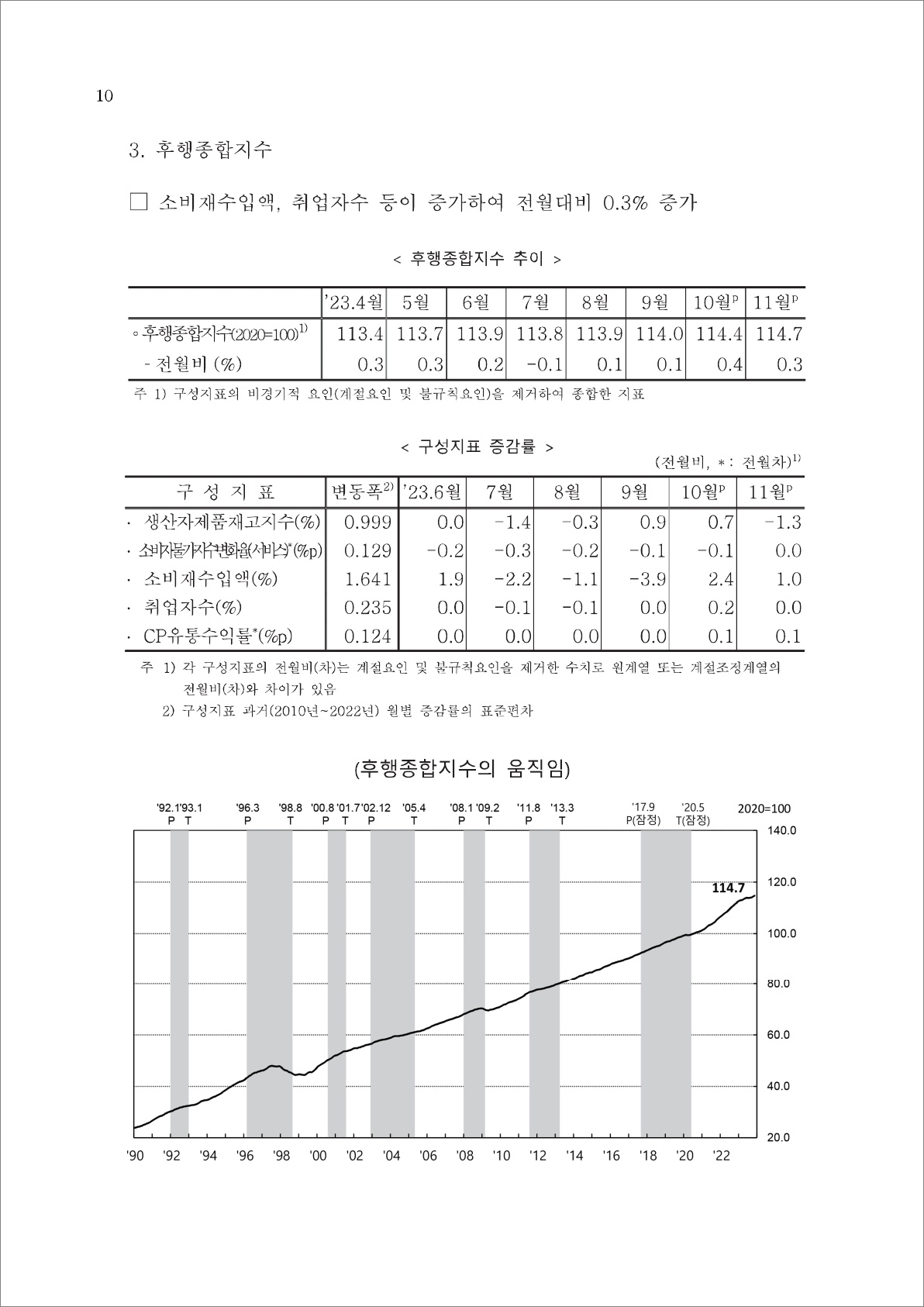 - 후행종합지수는 실제 경기순환에 후행하여 변동하는 개별지표를 가공·종합하여 만든 지표로 현재 경기의 사후 확인에 활용된다.