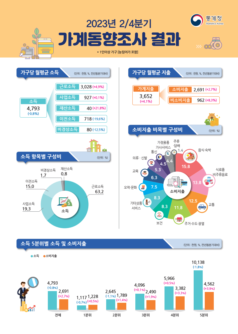 5. 2023년 2/4분기 가계동향(요약)에 따르면 최근 보도자료는 아래 내용으로 정리할 수 있겠다.