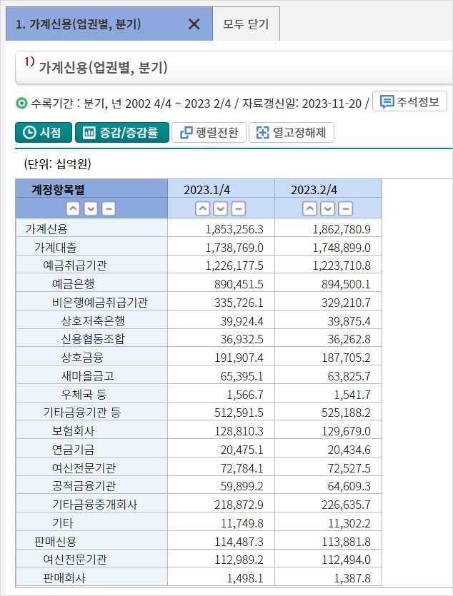 아래 데이터를 확인해 보면 2023년도 2분기 가계신용통계는 1,862조 7,809억 원으로 집계된다.