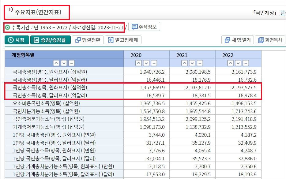 2. 주요 지표(연간지표)에서 국민총소득(명목)을 확인할 수 있다.